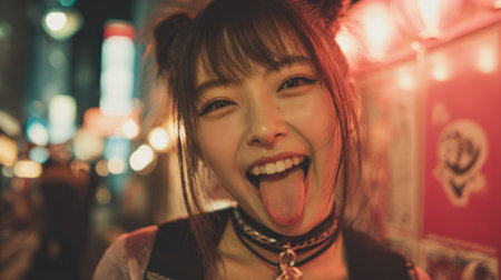 A young woman stands in a colorful urban environment with neon lights, playfully sticking out her tongue. She appears excited and carefree, embodying the lively spirit of the night.