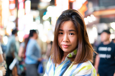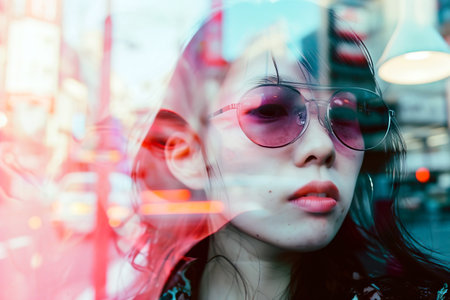 Japanese woman street portrait in Tokyo, double exposure, motion blur and dizzy effect