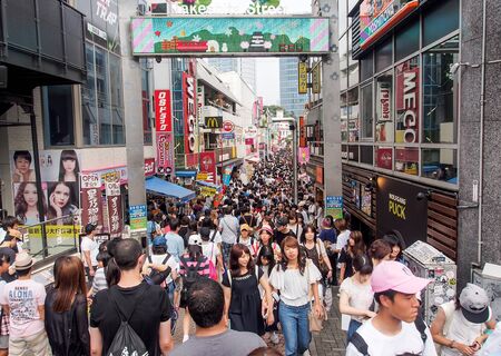busy harajuku takeshita street taken during summer day with many shops and restaurants. Tokyo, Japan. June 28th 2019