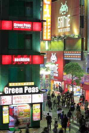 Tokyo, Japan - August 2018: Long exposure photo of Taito station arcade gaming center stands as visitors passes by