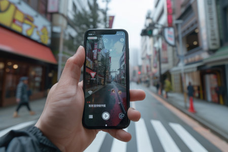 Close up of smart man hand holding camera while record video at japanese road or city street. Attractive people holding telephone or cell phone while recording view as japanese background. AIG42.
