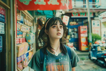 Young Woman Exploring Urban Japanese Alley Filled with Colorful Signboards and Cultural Advertisements AI Generative