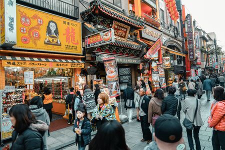 Yokohama, Japan - November 20, 2018 : Tourists are walking, shopping and eating in Chinatown at YOKOHAMA, JAPAN. Cinema tone concept.
