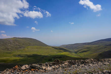 Beautiful landscape in the mountains at summer in daytime. Mountains at the sunset time. Azerbaijan, Caucasus. Khinalig