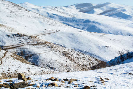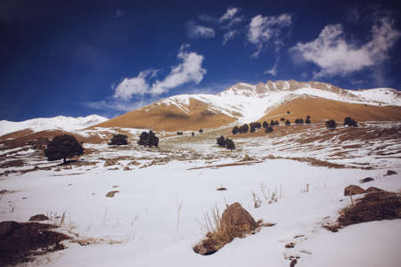 Mountains with melting snow. The end of winter, the beginning of spring. Kyrgyzstan Tourism and travel
