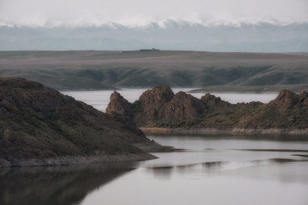 Dramatic rocky outcrops rise from the shore of Kurtinskoye Reservoir in Kazakhstan, with distant snow-capped mountains visible on the horizon. A tranquil and scenic natural landscape.