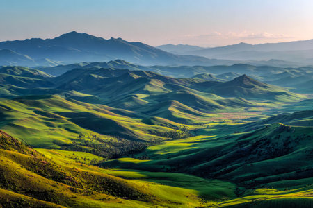 Gentle slopes stretch across lush greenery as distant peaks fade into the horizon, bathed in warm, diffuse sunlight that evokes tranquility and natural beauty.
