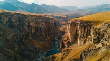 mountain landscape, view of the deep canyon with blue water, valley of the Sulak river in Dagestan