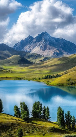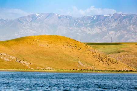 Kyrgyz nature. Lakes between hills. Scenic landscape.