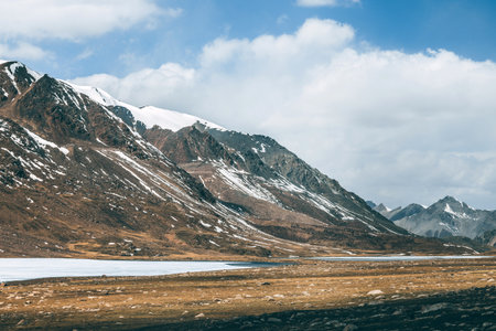 A frozen lake in the mountains. Arabel High Plateau in the Barskoon Mountain Gorge, Kyrgyzstan. Beautiful natural landscape, travel destination