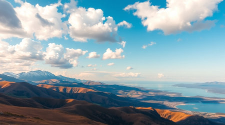 Nature landscape with golden field, wather, hills and blue sky with white clouds in a day or evening
