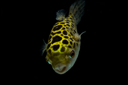 Boxfish in the aquarium on a black background, close-up