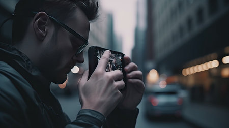 Social media communication. POV . Unrecognizable male taking picture in selective focus, modern technology concept
