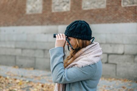 Close up view of young photographer taking photos in the city. Dressed in warm jacket, white watches.