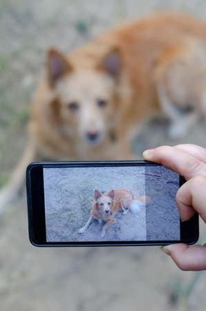Portrait of a red mixed breed dog on a smartphone display.Female hand holds the phone in front of a pet lying on the ground. Animal lover. Outdoor shooting