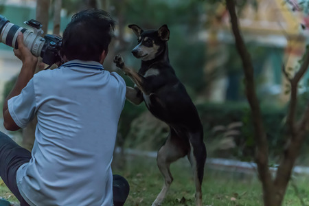 Man hand holding and using mobile,cell phone,smart phone photography and a puppy on concrete floor with blurred puppy on concrete floor.