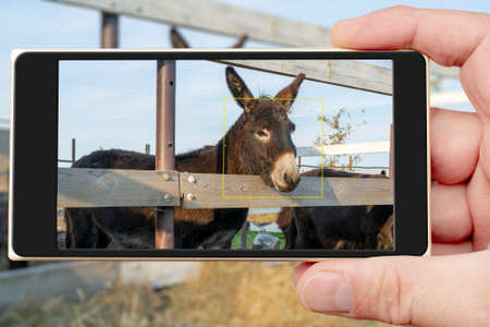 Tourist hands taking a photo by mobile smart phone of goats, lamb, or sheep in farm at zoo park in rural area. Wild mammal animal in nature in safari or pasture in travel on holiday concept.