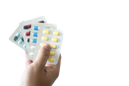 man Hand holding medicine pack at the pharmacy Variety of medicines and drugs