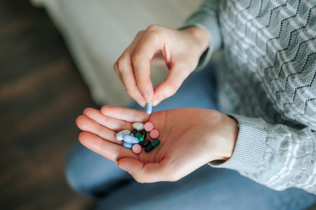 Individual preparing to take various medications indoors in a relaxed setting