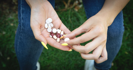 woman holding pills outdoors.