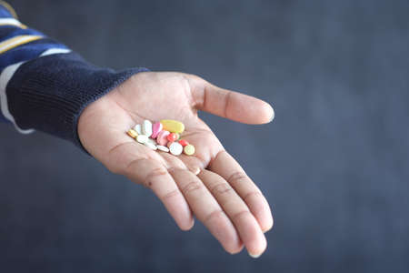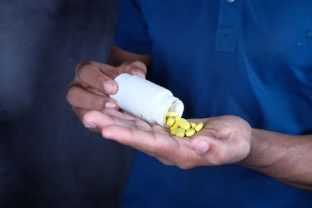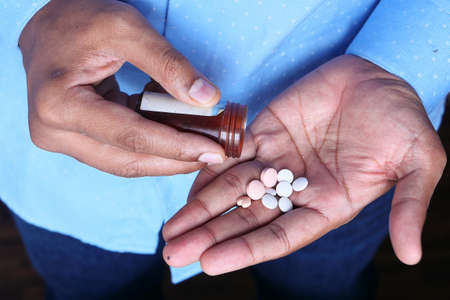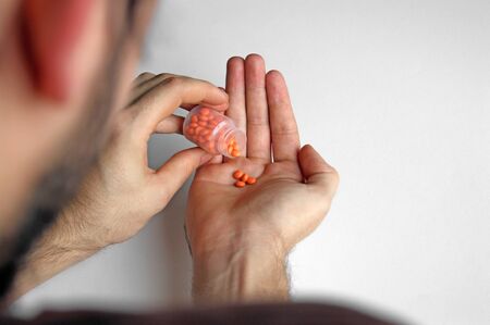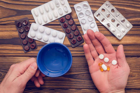 Close-up of male hands holding medicine and he is going to drink them from disease