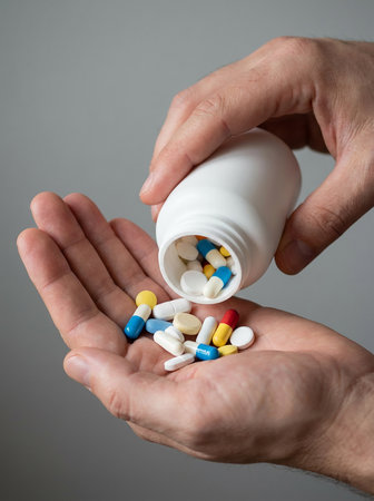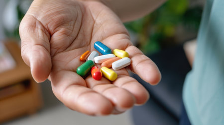 A person holds a vibrant mix of pills and capsules in their hand, symbolizing health and wellness. This image conveys themes of medication, care, and daily nutrition.