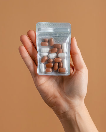 Close up Hand Holding Blister Pack of Brown Capsules Against Neutral Background for Healthcare and Medicine Concepts AI Generative