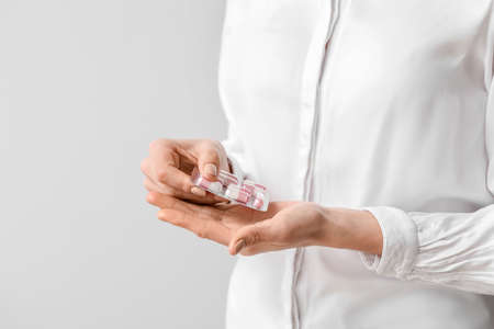 Young woman holds white pill in a hand, take medicine from blister pack, close-up view.