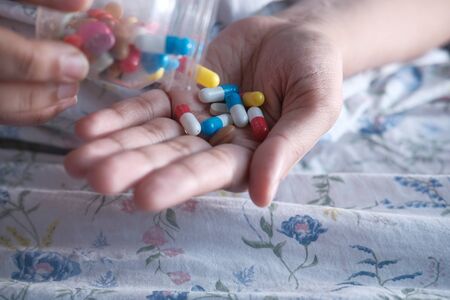 Close up medicine bottle and pills or capsules in hand, palm or fingers. Drug prescription for treatment medication. Pharmaceutical medicament, Antibiotic, vitamins.