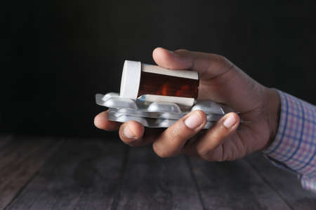 man hand holding pill bottle and blister pack isolated on black