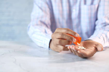 Top view of mans hands taking medicine
