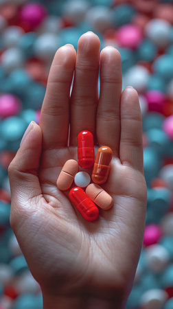 A close-up of a hand holding various colorful capsules and pills, representing healthcare, medication, and medical treatment in a modern setting.