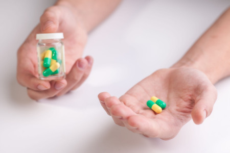 Young adult hand taking a daily dose of medicine for a chronic disease. Caucasian person with a painkiller addiction problem