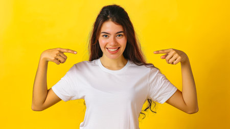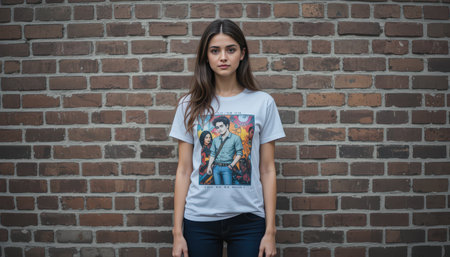 A young woman poses confidently in a graphic t-shirt, set against a rustic brick wall backdrop, exuding casual style.