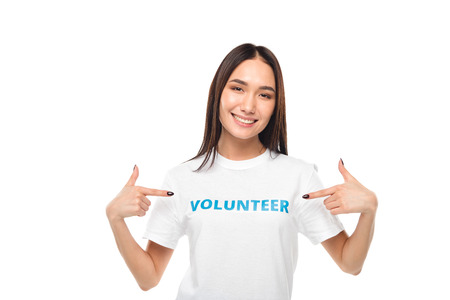asian female volunteer pointing at sign on t-shirt isolated on white