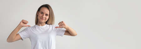 This is me. Portrait of happy self-confident woman pointing at herself and smiling joyfully, feeling proud and successful. indoor studio shot isolated on gray gray background, copy space, banner