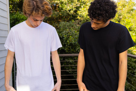 Two caucasian men wearing white and black short sleeved t shirts on balcony with copy space. Fashion, trends, clothes concept, unaltered.