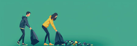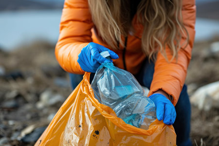 Witness the impactful scene of dedicated volunteers wearing gloves as they passionately collect plastic garbage outdoors. This powerful image embodies the essence of volunteering, ecology, and the collective effort to combat plastic pollution for the greater cause of environmental conservation.