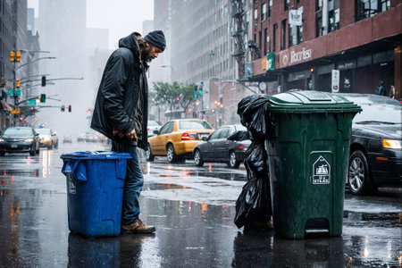 A dedicated individual engages in environmental cleanup, sorting through plastic waste and trash in an urban area, highlighting the need for sustainability.