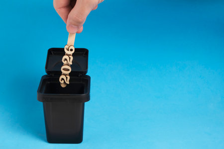 Concept the end year 2026. Hand puts wooden sign with 2026 into garbage bin