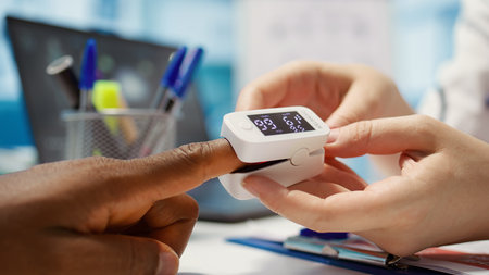 Close-up image of doctor measuring oxygen saturation of patient with pulse oximeter device
