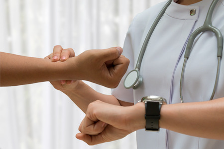 Close-up of doctor checking pulse. Woman doctor talking to female patient in hospital office while examining the pulse by hand. Healthcare and medical service concept