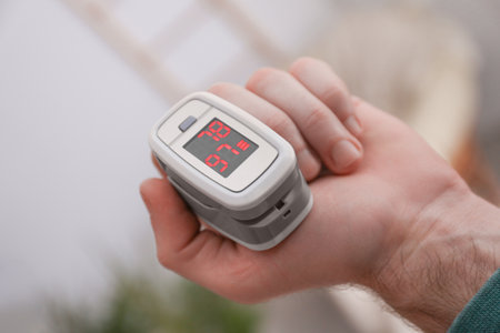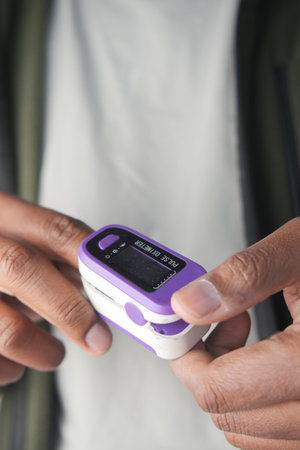 Man using finger pulse oximeter, healthcare monitoring concept. Pulse oximeter on a background