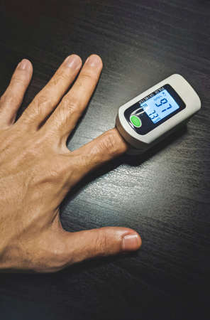 hand of a man measuring the oxygenation and pulse of the heart with oximeter