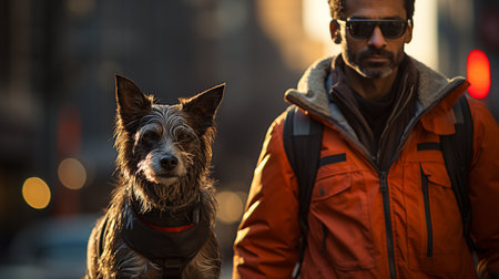 A cheerful young man walks his dog through a bustling urban environment at sunset. The warm evening light creates a lively atmosphere, capturing the joy of companionship.