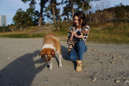 Woman with camera kneels on a sandy surface with her dog, capturing a candid outdoor moment in casual wear, plaid shirt and boots, under warm sunlight.