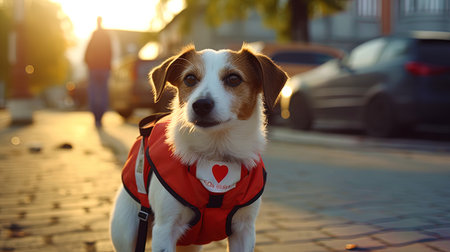 The guide dog, with a calm and focused demeanor, leads the blind person confidently, providing guidance and support.