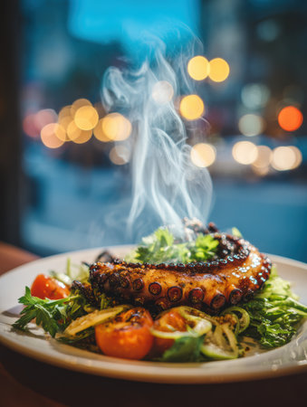 Sizzling spicy grilled octopus emits steam as it rests on a bed of fresh greens and tomatoes, capturing attention in a lively dining scene.