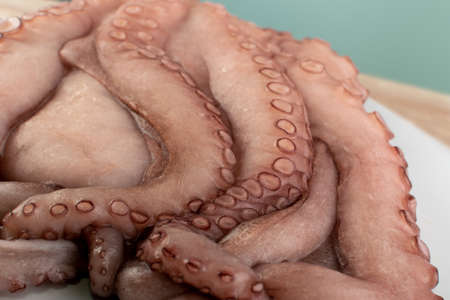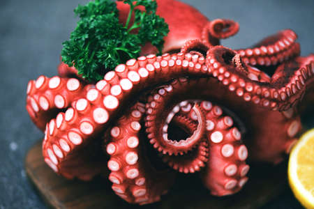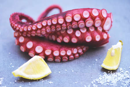 Boiled octopus tentacles with lemon on plate background, Octopus food cooked salad seafood squid cuttlefish dinner restaurant