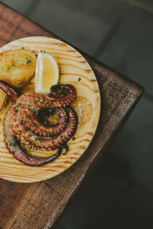 Restaurant, lifestyle, travel food - grilled octopus, potato. gourmet dinner, lunch with seafood